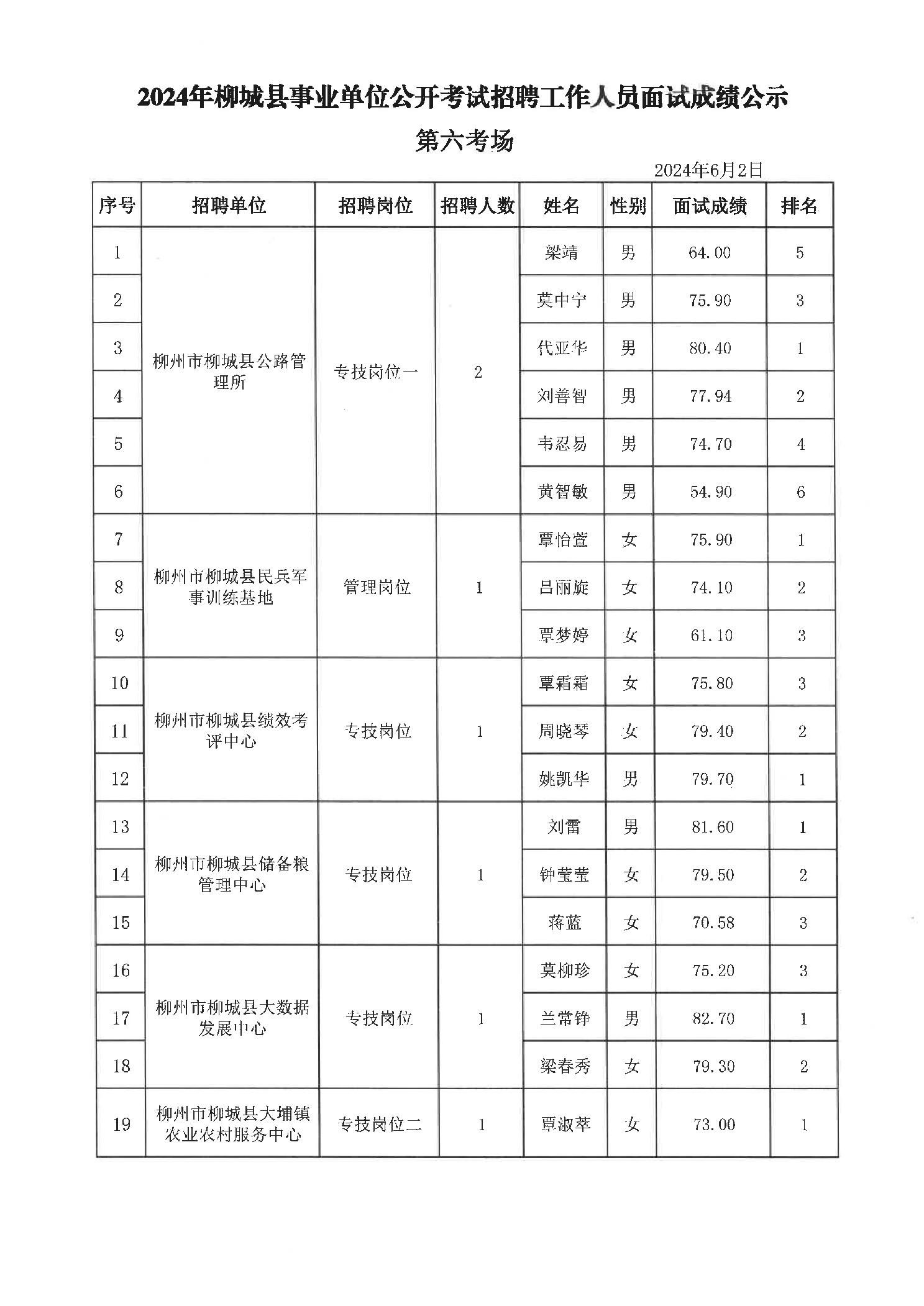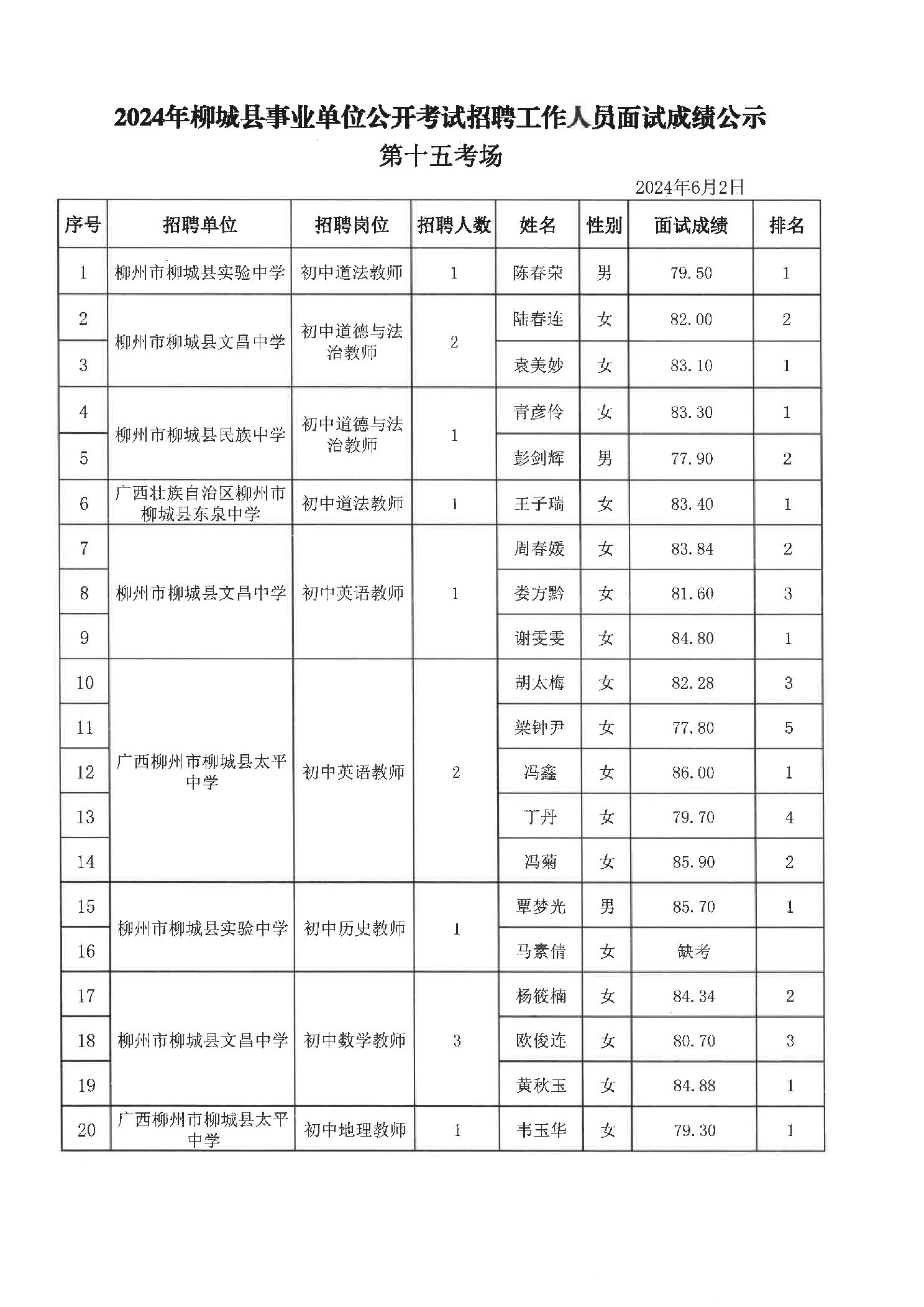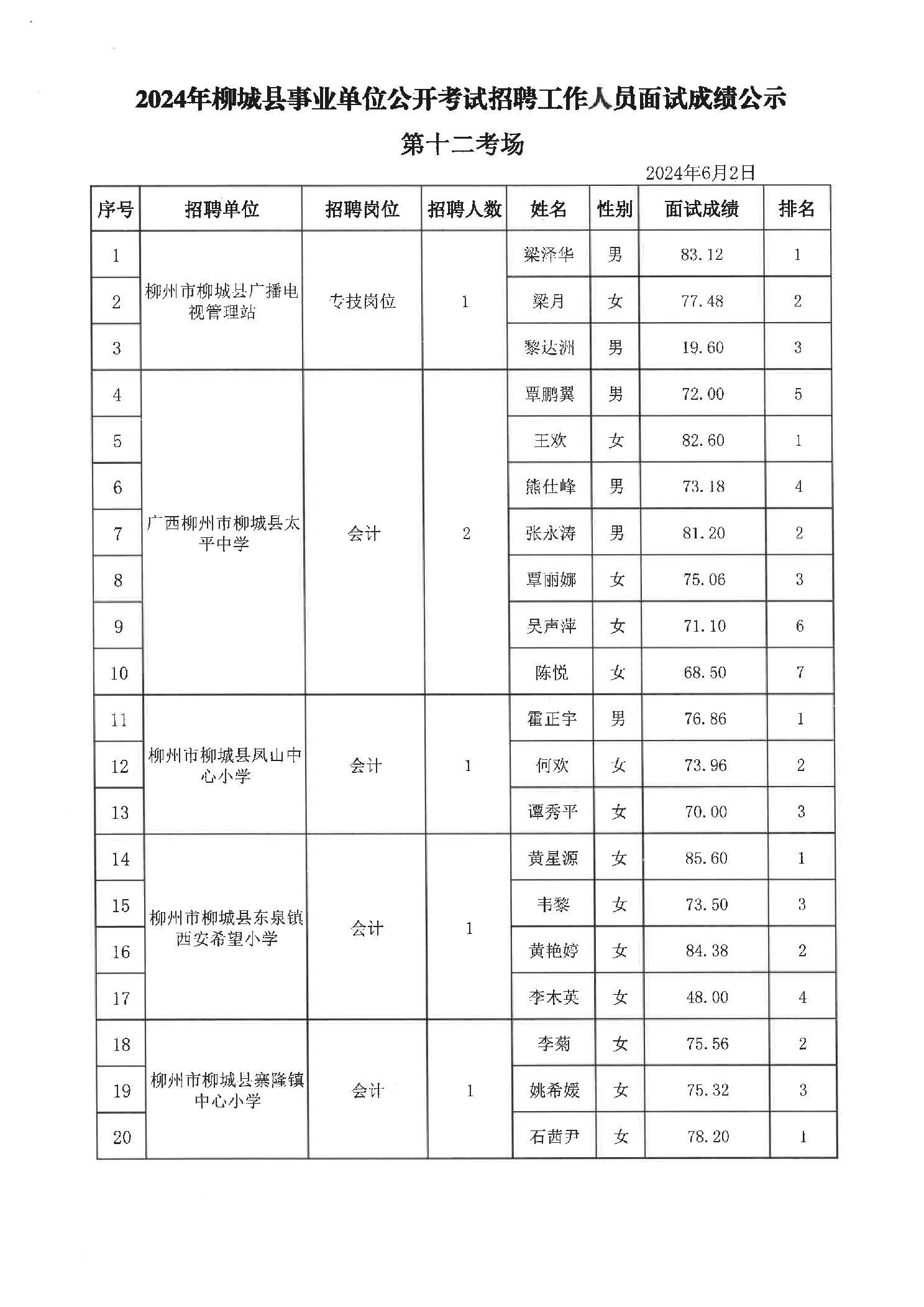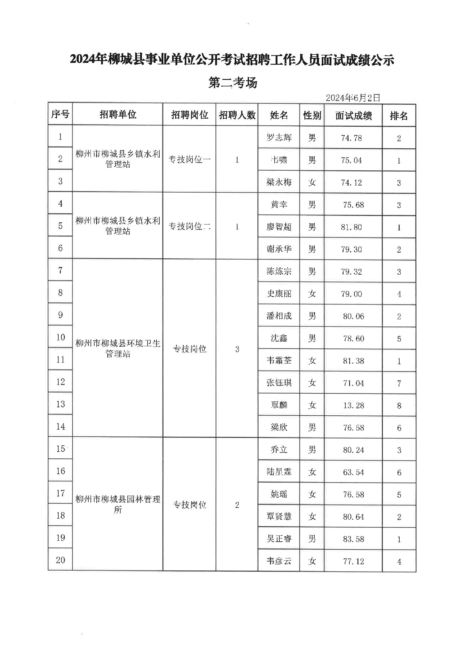 2024年柳城縣事業(yè)單位公開考試招聘工作人員面試成績(jī)公示