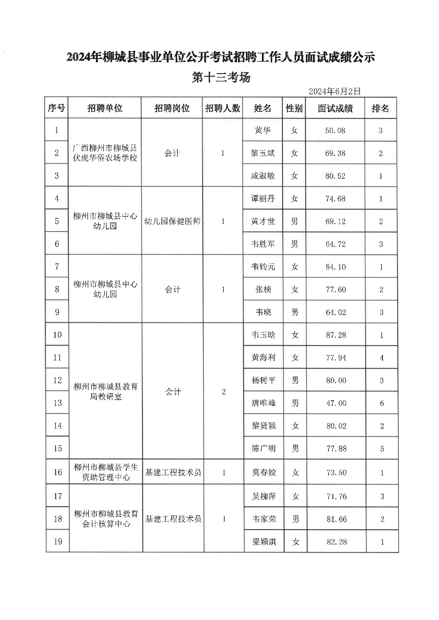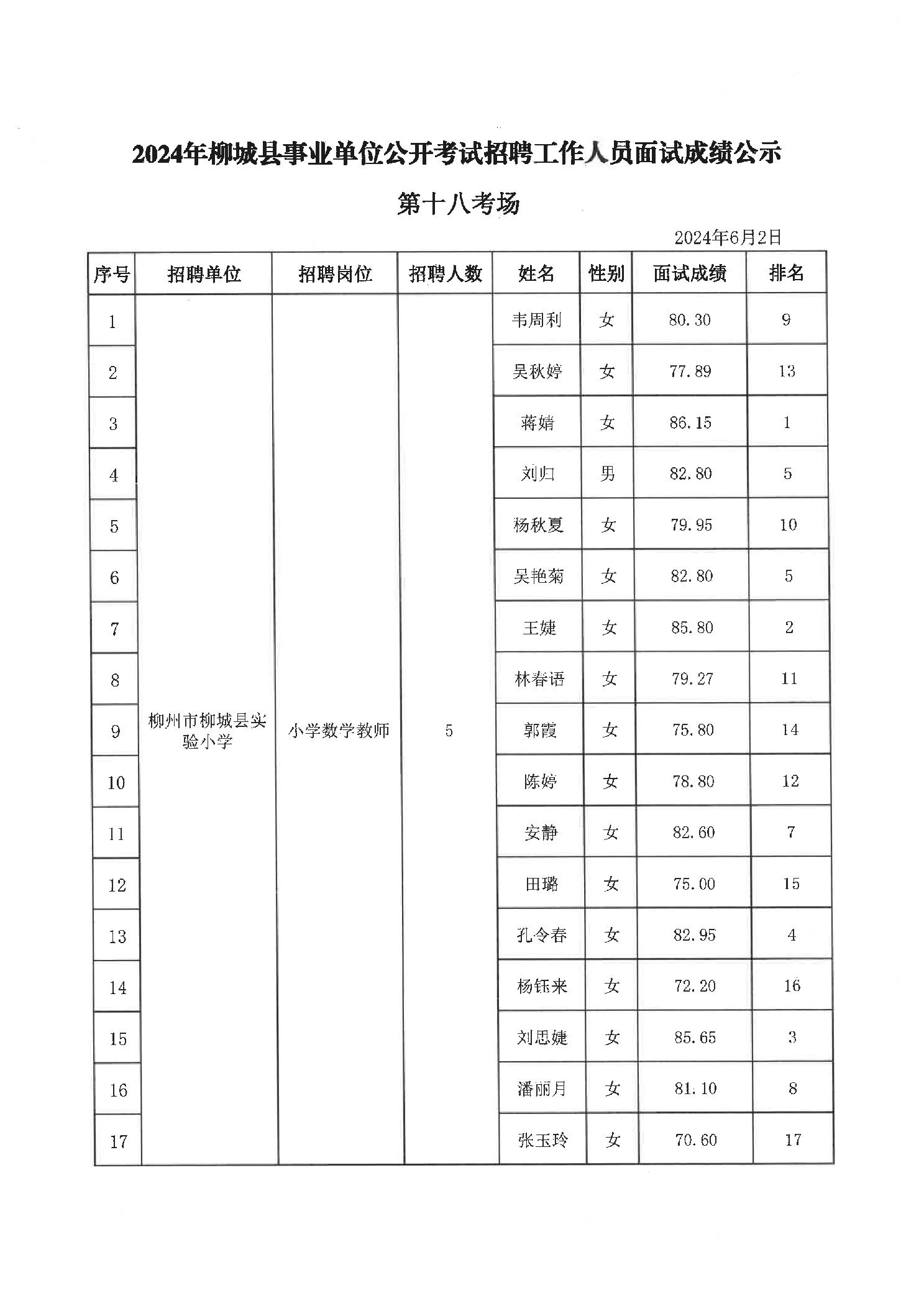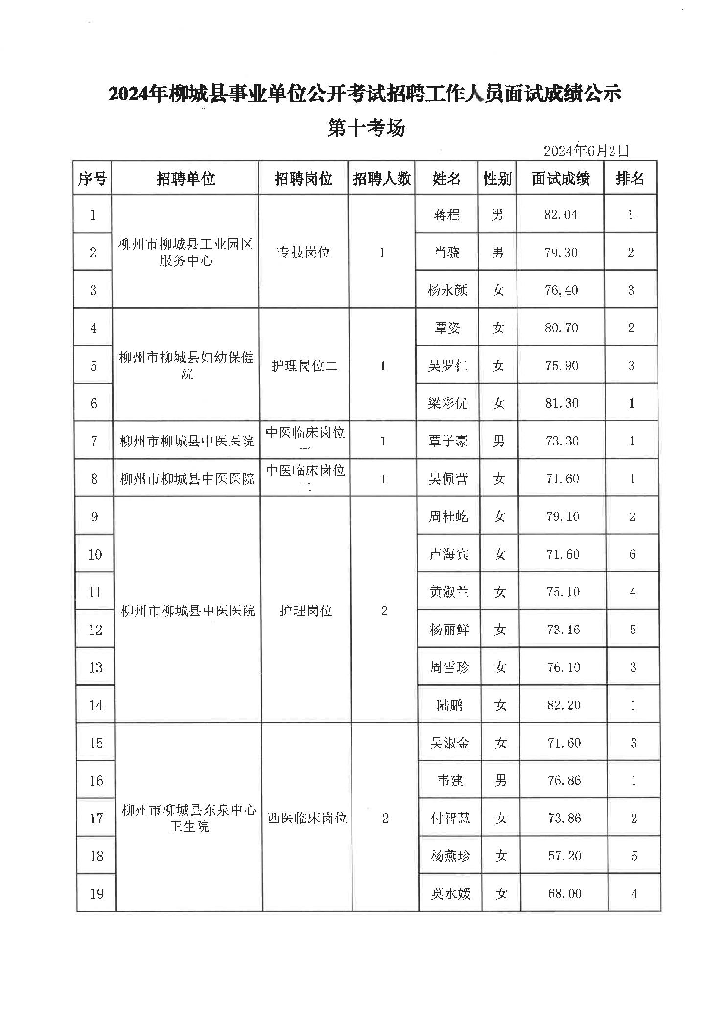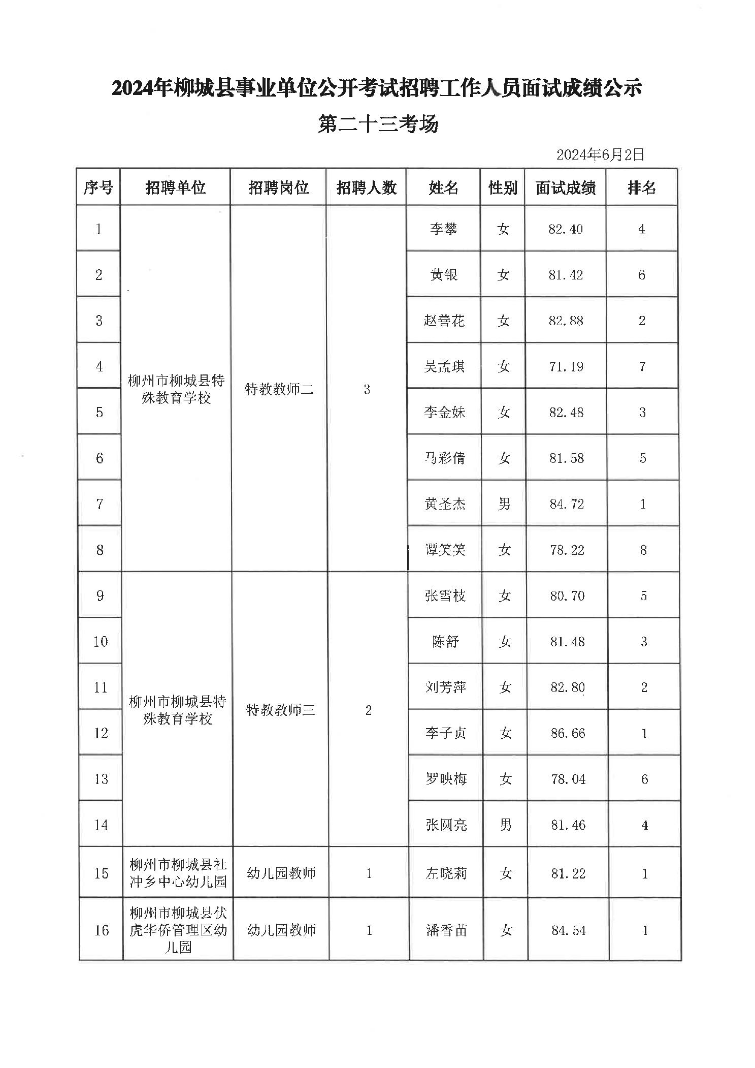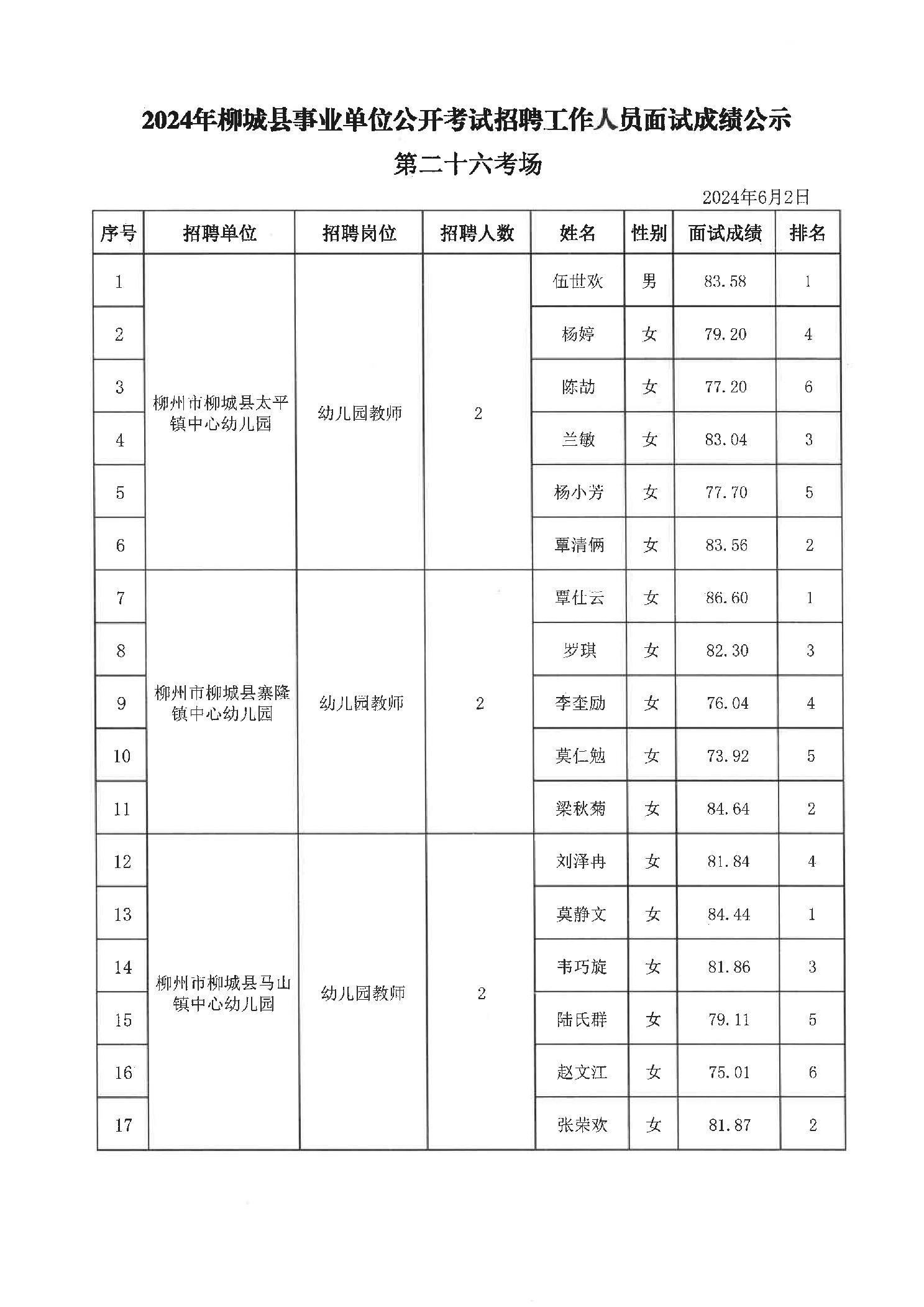 2024年柳城縣事業(yè)單位公開考試招聘工作人員面試成績(jī)公示