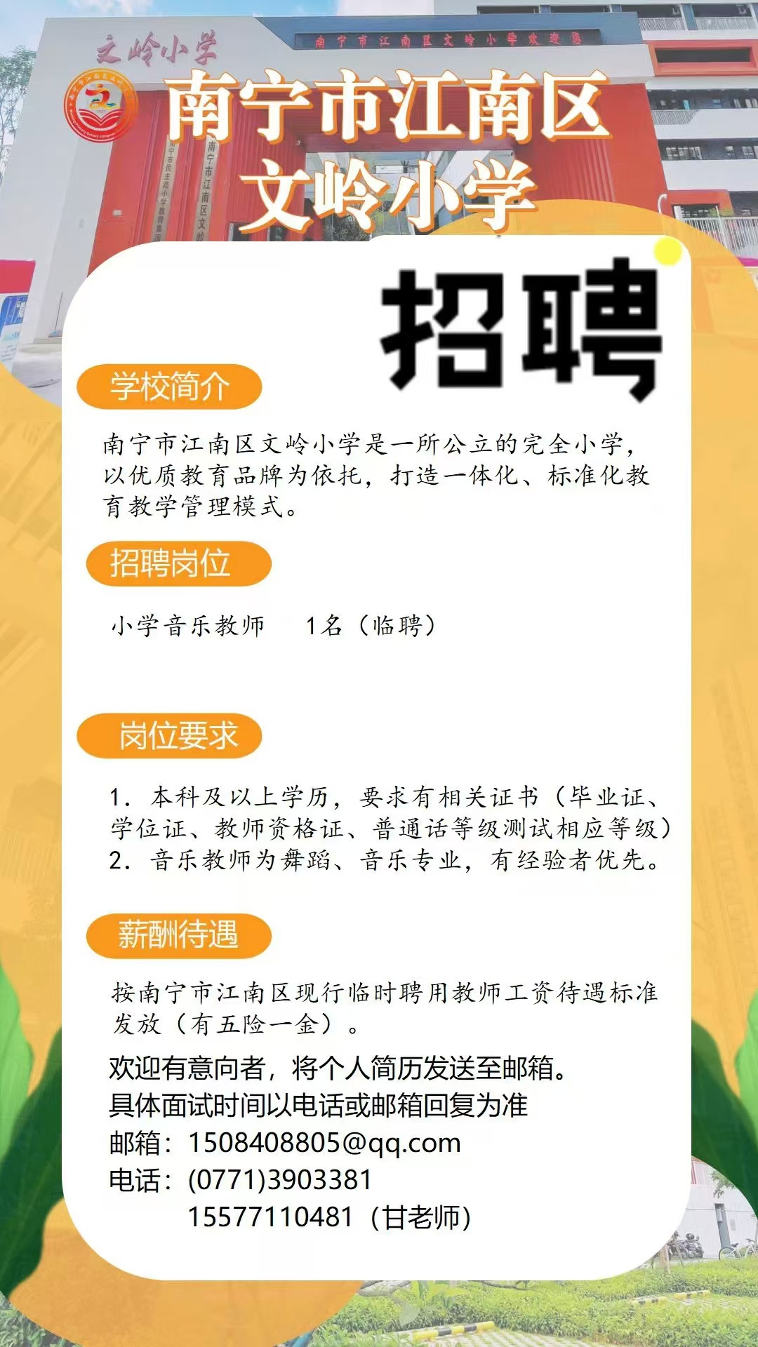 南寧市江南區(qū)文嶺小學(xué)招音樂老師