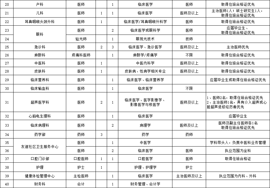 (二)臨床、醫(yī)技、護(hù)理等崗位人才(緊缺急需專業(yè):重癥醫(yī)學(xué)科、全科醫(yī)學(xué)科、康復(fù)醫(yī)學(xué)科、感染性疾病科、急診科、兒科、麻醉科、眼科、皮膚科、病理科、心腦電生理科等科室醫(yī)師)