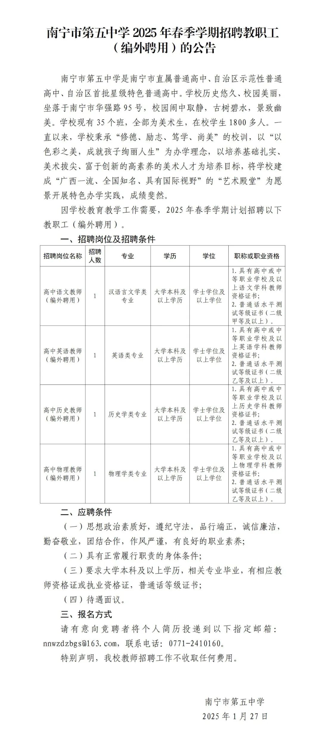 2025年南寧市第五中學(xué)春季學(xué)期招聘教職工(編外聘用)的公告
