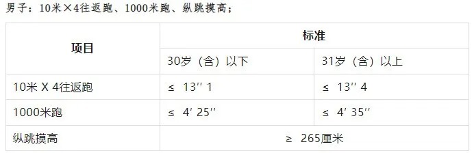2.體能測評項(xiàng)目和標(biāo)準(zhǔn)按照《公安機(jī)關(guān)錄用人民警察體能測評項(xiàng)目和標(biāo)準(zhǔn)(暫行)》執(zhí)行。體能測評標(biāo)準(zhǔn)報(bào)考人員須參加全部三項(xiàng)體能測評,全部達(dá)標(biāo)方為合格,如放棄一項(xiàng)則視為不合格,體能測評合格的方可進(jìn)入下一環(huán)節(jié)。