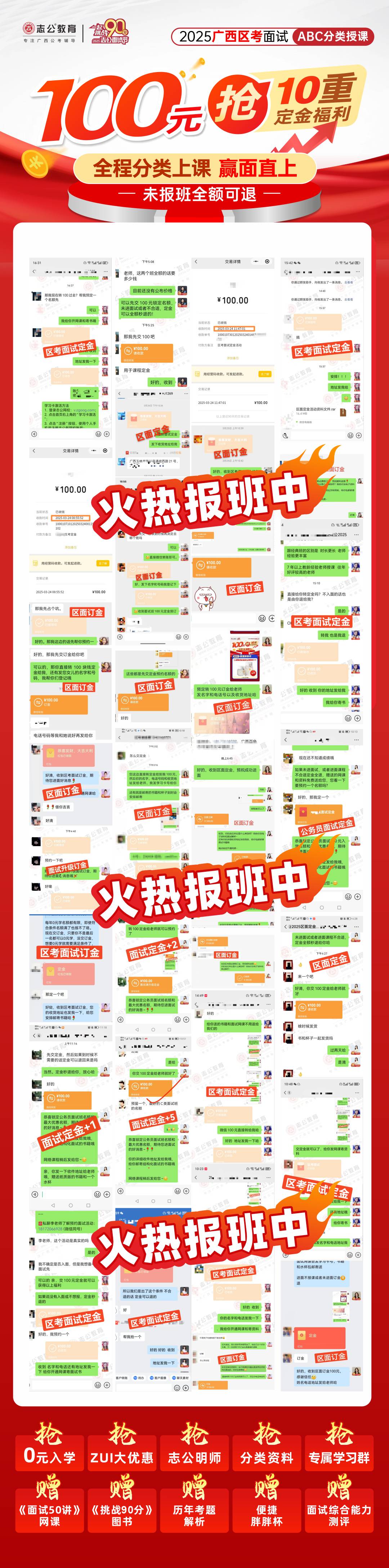 告訴大家個(gè)好消息!志公教育推出了2025年廣西區(qū)考面試ABC分類授課,現(xiàn)在只要100元就能搶到10重定金福利,聽(tīng)起來(lái)是不是很誘人?