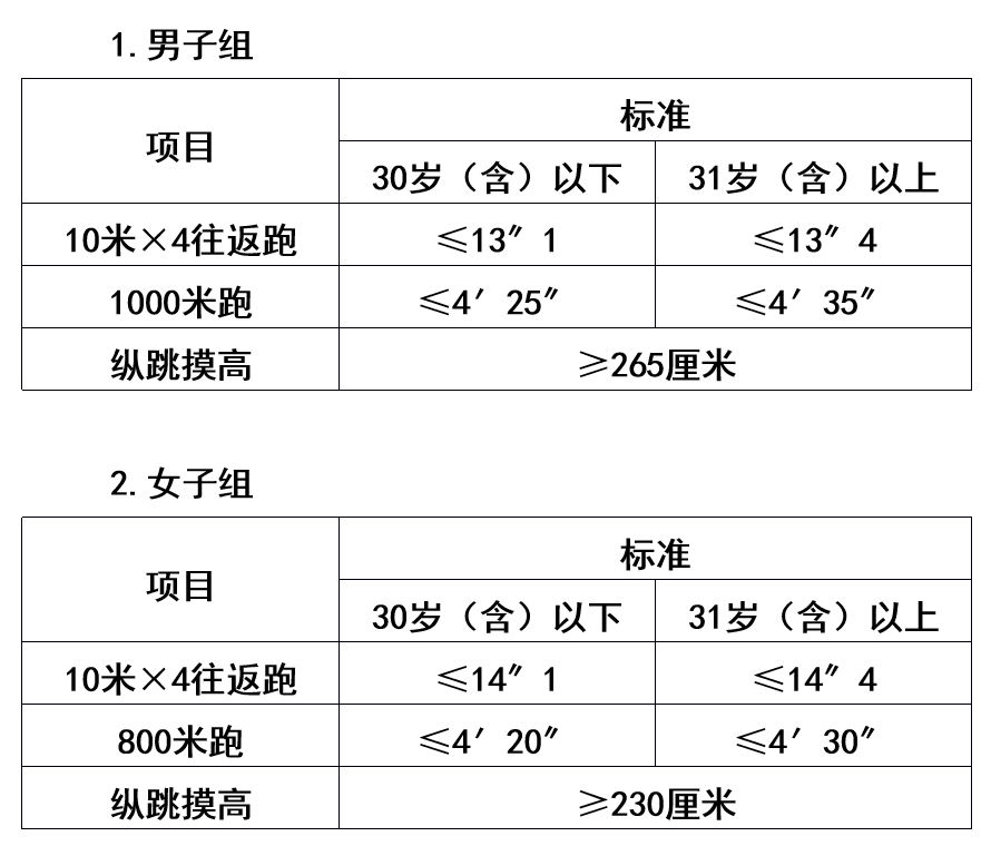 年齡計(jì)算時(shí)間截止到參加體能測(cè)評(píng)當(dāng)月。縱跳摸高項(xiàng)目的測(cè)評(píng)次數(shù)不超過(guò)3次,10米×4往返跑項(xiàng)目的測(cè)評(píng)次數(shù)不超過(guò)2次,男子1000米跑、女子800米跑項(xiàng)目的測(cè)評(píng)次數(shù)均為1次。