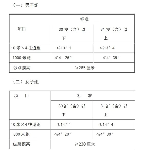 4.報考人員須參加全部三項體能測評,全部達標方為合格,如放棄一項則視為不合格,體能測評合格的方可進入下一環(huán)節(jié)。