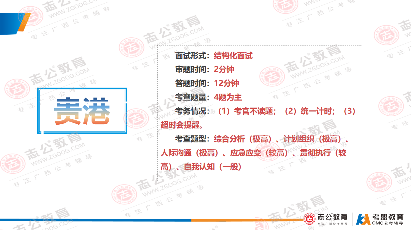 貴港事業(yè)單位面試主要采用結構化面試形式;審題時間:2分鐘;答題時間:12分鐘;考查題量:4題為主??紕涨闆r:考官不讀題、統(tǒng)一計時、超時會提醒。考查題型:綜合分析(極高)、計劃組織(極高)、人際溝通(極高)、應急應變(較高)、貫徹執(zhí)行(較高)、自我認知(一般)。