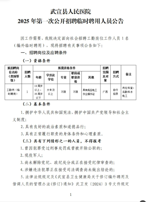 原文標題:武宣縣人民醫(yī)院2025年第一次公開招聘臨時聘用人員公告