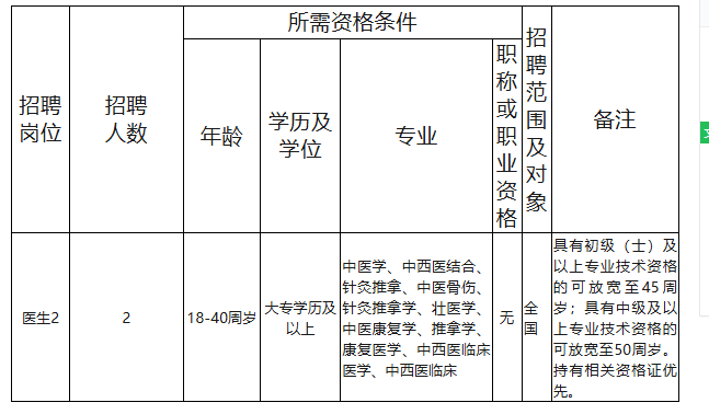 根據(jù)工作需要,決定面向社會(huì)公開(kāi)招聘醫(yī)生(中醫(yī)類)2人,現(xiàn)將有關(guān)事項(xiàng)公告如下: