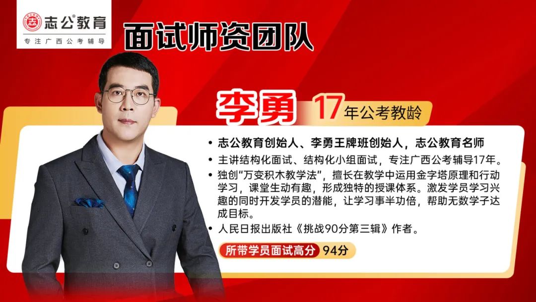 李勇——志公教育創(chuàng)始人、李勇王牌®班創(chuàng)始人,志公教育名師。主講結(jié)構(gòu)化面試、結(jié)構(gòu)化小組面試,專注廣西公考輔導(dǎo)17年。獨(dú)創(chuàng)“萬變積木教學(xué)法”,擅長在教學(xué)中運(yùn)用金字塔原理和行動學(xué)習(xí),課堂生動有趣,形成獨(dú)特的授課體系。激發(fā)學(xué)員學(xué)習(xí)興趣的同時(shí)開發(fā)學(xué)員的潛能,讓學(xué)習(xí)事半功倍,幫助無數(shù)學(xué)子達(dá)成目標(biāo)。同時(shí)也是人民日報(bào)出版社《挑戰(zhàn)90分第三輯》作者。