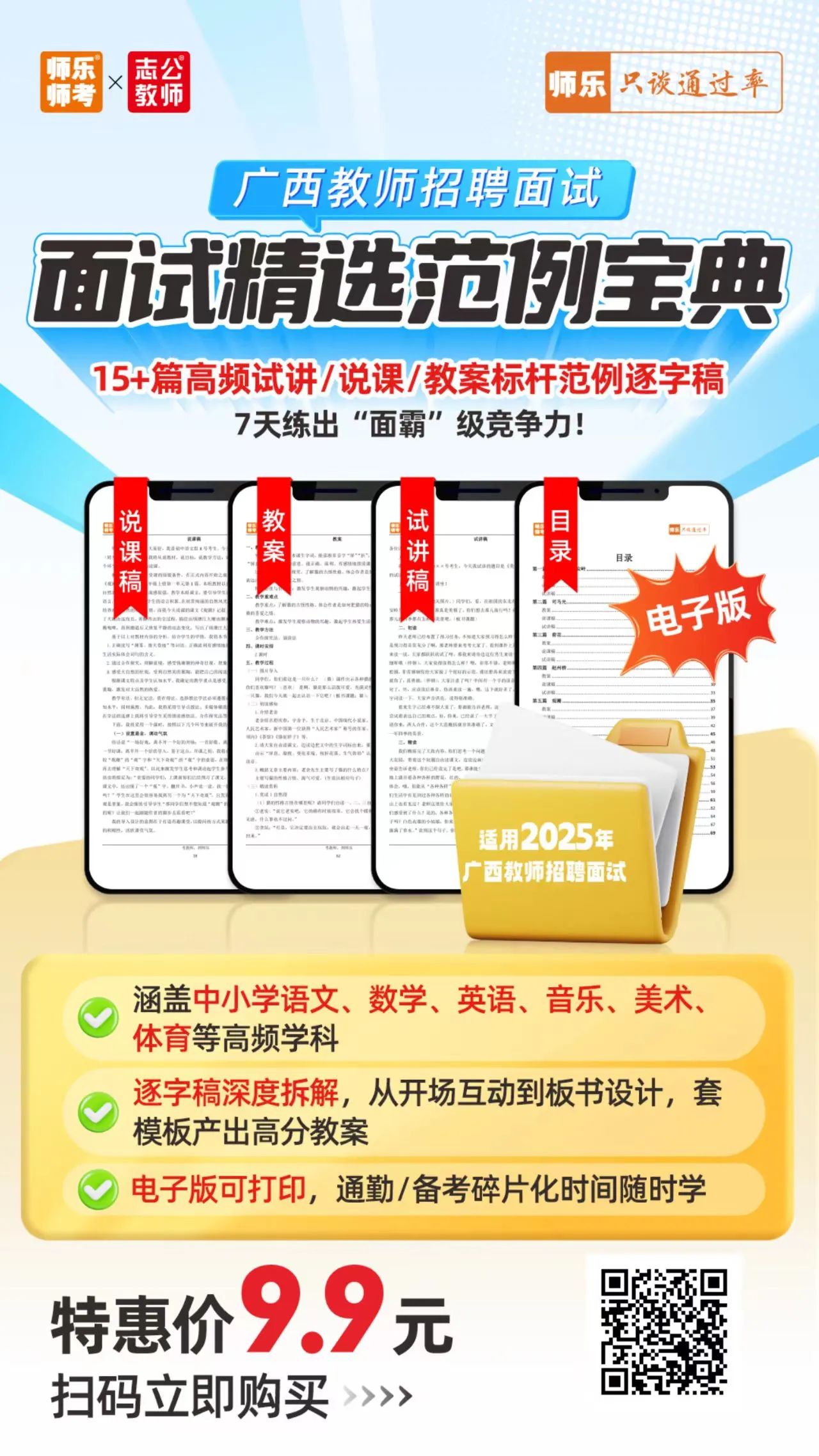 ??寫作邏輯+面試導(dǎo)入金句點(diǎn)撥 ?含13+篇試講+說(shuō)課+結(jié)構(gòu)化 搶先體驗(yàn)價(jià):6.9元 ??14地市教招面試zhen題 了解試講/說(shuō)課/結(jié)構(gòu)化形式及內(nèi)容 面試禮儀課 ??面試禮儀干貨介紹 正反面案例直觀對(duì)比 ??著裝、問(wèn)候、儀態(tài)、言談禮儀等事項(xiàng)介紹 【師樂(lè)】廣西教招備考群 ??最新公告 備考資料 ??刷題打卡 考試交流