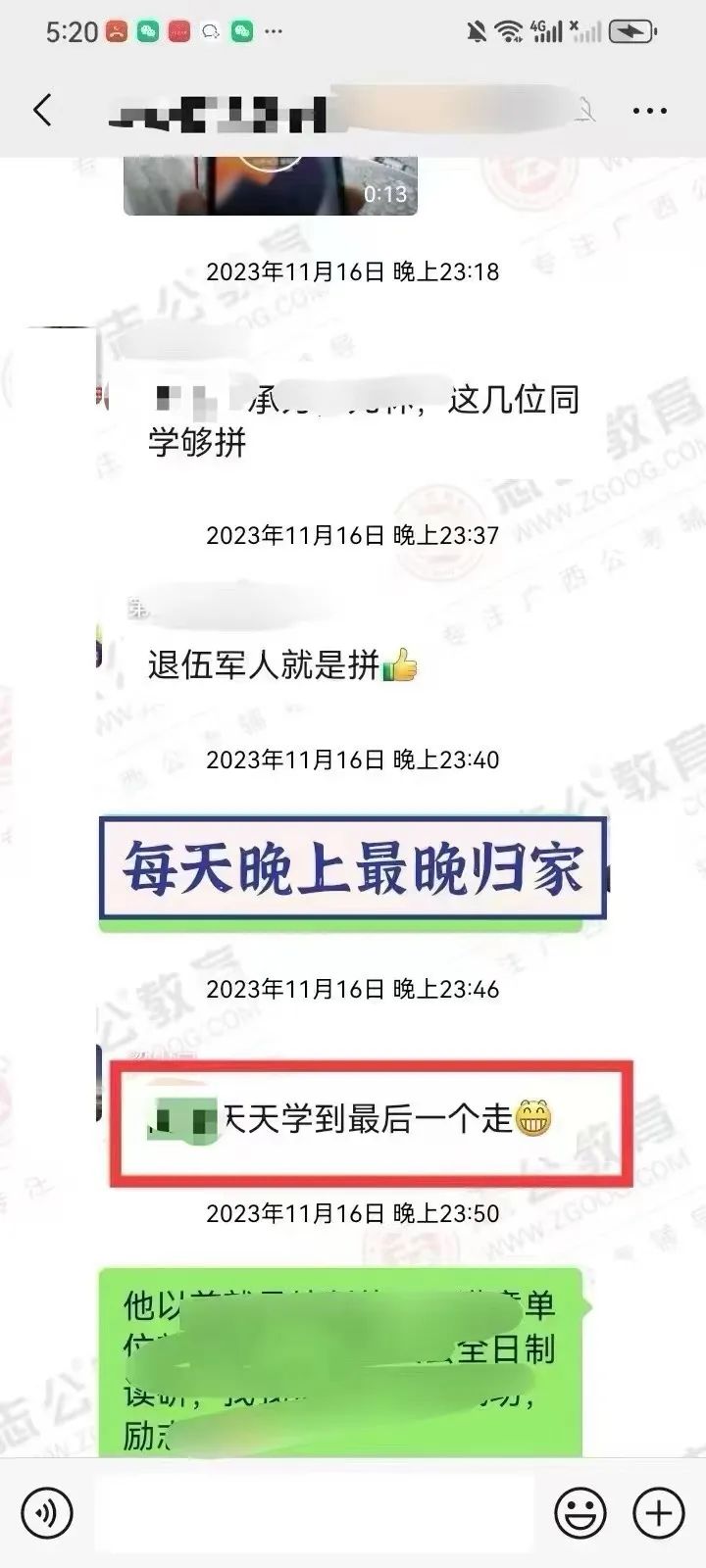 在備考的日子里,無數(shù)個(gè)夜晚,我看到他朋友圈發(fā)的經(jīng)常學(xué)習(xí)練習(xí)到教室關(guān)門最后一個(gè)才回家,無數(shù)次往返南寧和桂林兩座城市,只為家庭和研究生學(xué)業(yè)和公務(wù)員備考的有序進(jìn)行,讓我印象最深的一次,就是他微信拍了一張正在打針輸液的照片發(fā)給我,還打趣的跟我說:還好不影響我單手刷題! 即使學(xué)員因?yàn)樯眢w過于勞累導(dǎo)致生病在吊針,也絲毫沒有懈怠過學(xué)習(xí),讓我非常的佩服和感動。