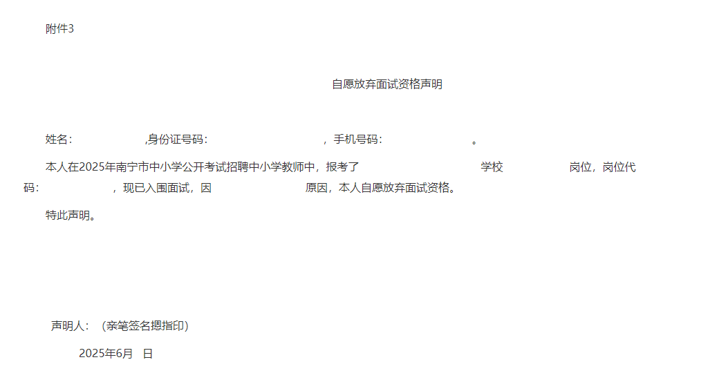 (四)放棄面試資格的報(bào)考人員,應(yīng)及時(shí)向面試資格復(fù)審單位提供書(shū)面放棄面試資格說(shuō)明材料(詳見(jiàn)附件3,包含:報(bào)考單位、崗位名稱和代碼、注明身份證號(hào)碼、手機(jī)號(hào)碼、本人簽名捺手印,材料可傳真或掃描發(fā)送郵箱:rs8223408@126.com),否則按相關(guān)規(guī)定處理。