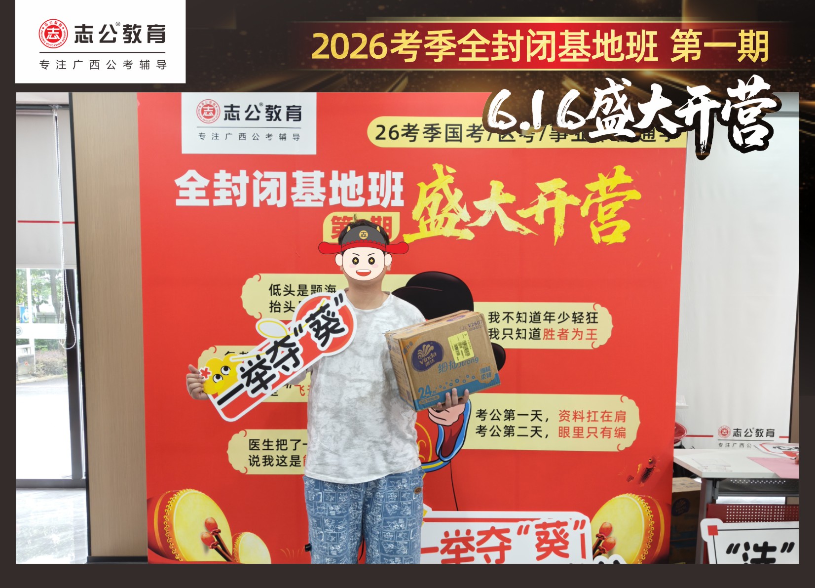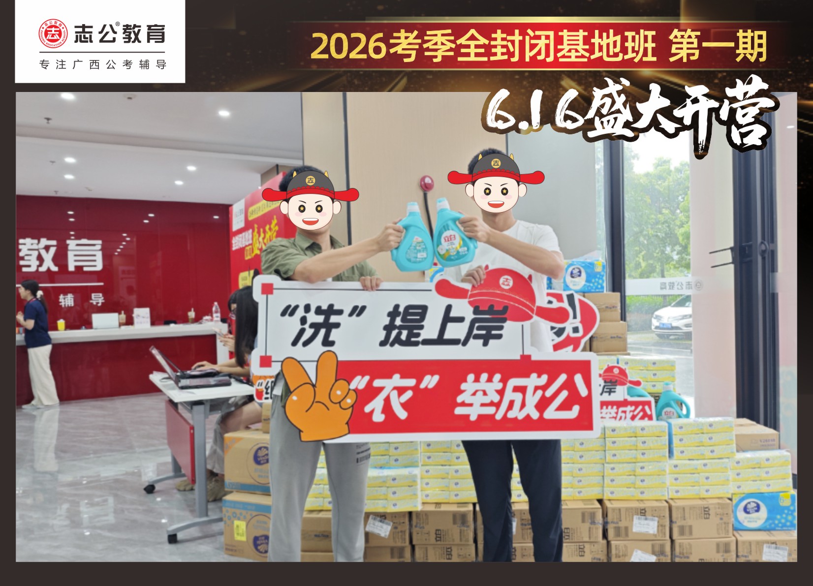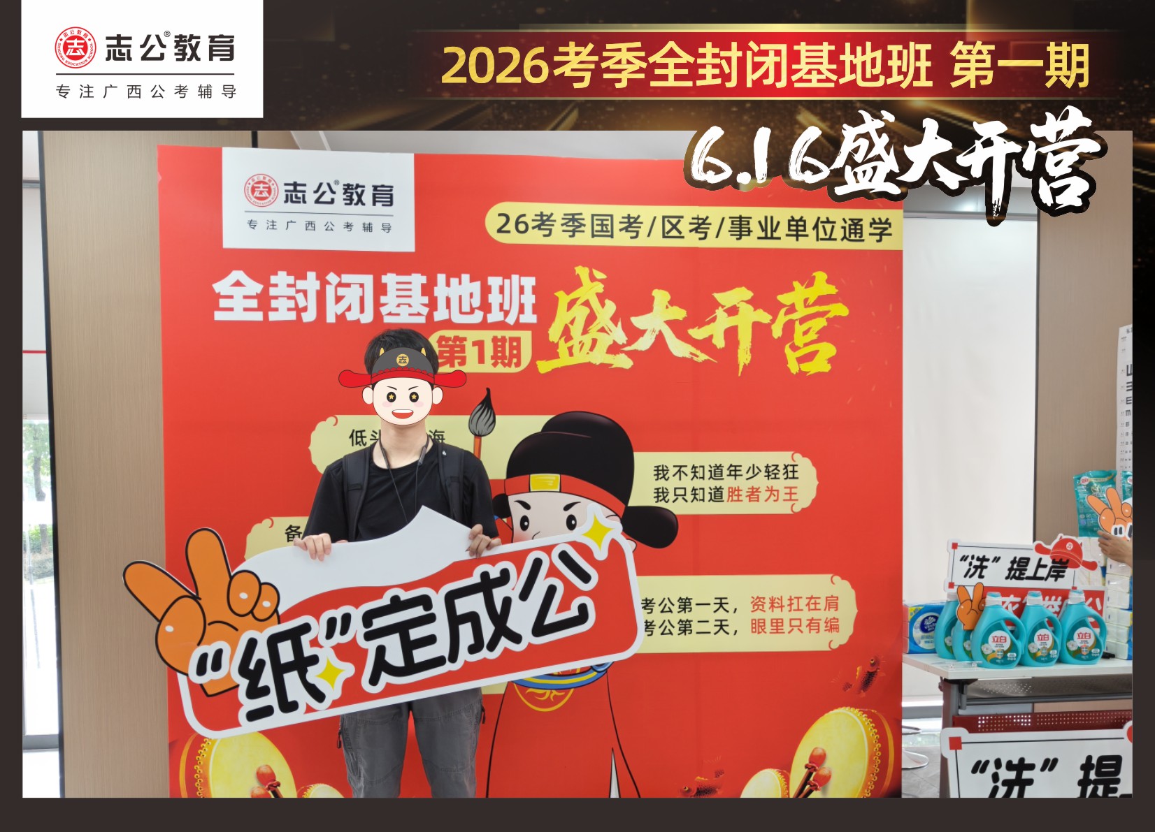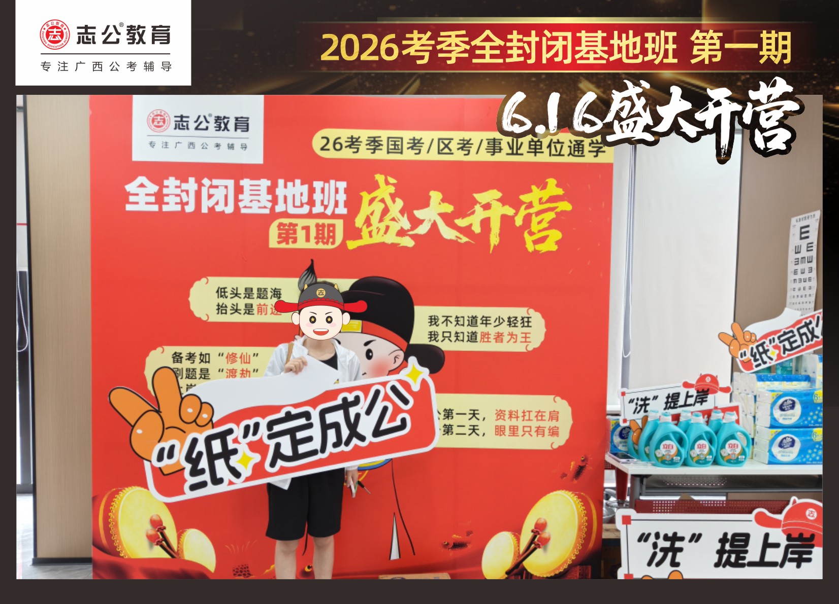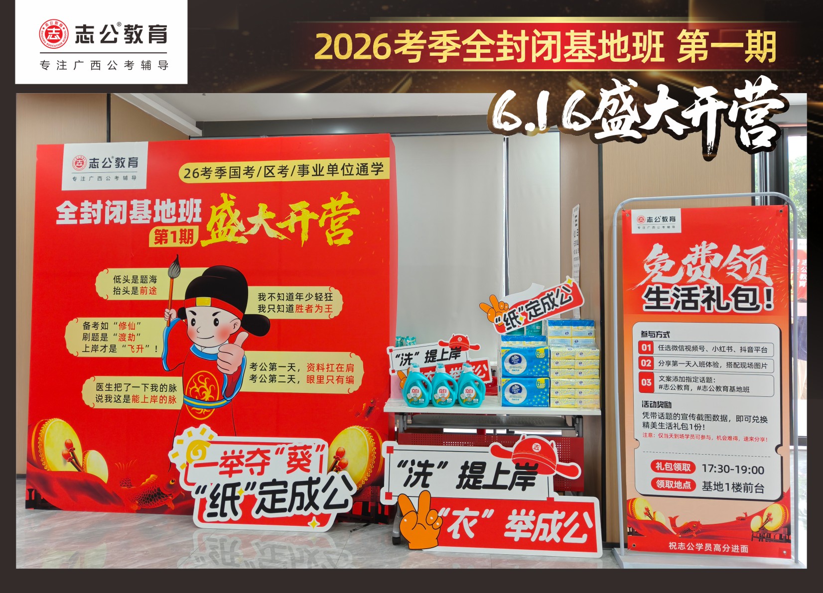今天的開班還有一系列小活動(dòng)噢~瞧!——“學(xué)員打卡活動(dòng)”,所有今天到場的基地班學(xué)員,通過做一些小任務(wù)的方式,可以到前臺領(lǐng)取生活禮包即可領(lǐng)取生活禮品1份(一提六包的紙巾,或者一瓶洗衣液),這也是志公教育對所有學(xué)員的美好祝愿,預(yù)祝大家未來能夠“紙”定成公,“洗”提上/岸,“衣舉成公”!