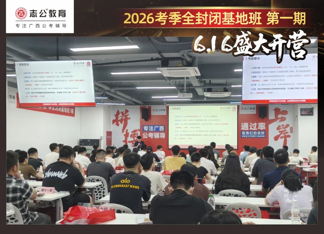 最后,要進(jìn)行的是摸底考試,志公教育26考季全封閉基地班第1期確實(shí)火爆,但是要知道廣西公考每年競爭對手更多人,只有通過考試才能知道自己在這么多學(xué)員中的水平情況,入營時(shí)的最初水平,更能知道自己在接下來的學(xué)習(xí)中是否有進(jìn)步!
