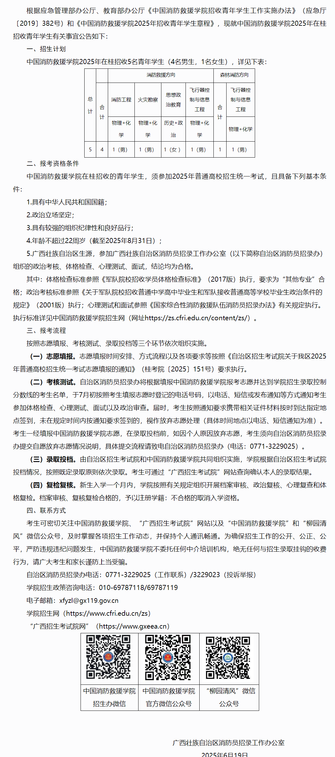 2025年中國(guó)消防救援學(xué)院面向廣西壯族自治區(qū)招收青年學(xué)生公告