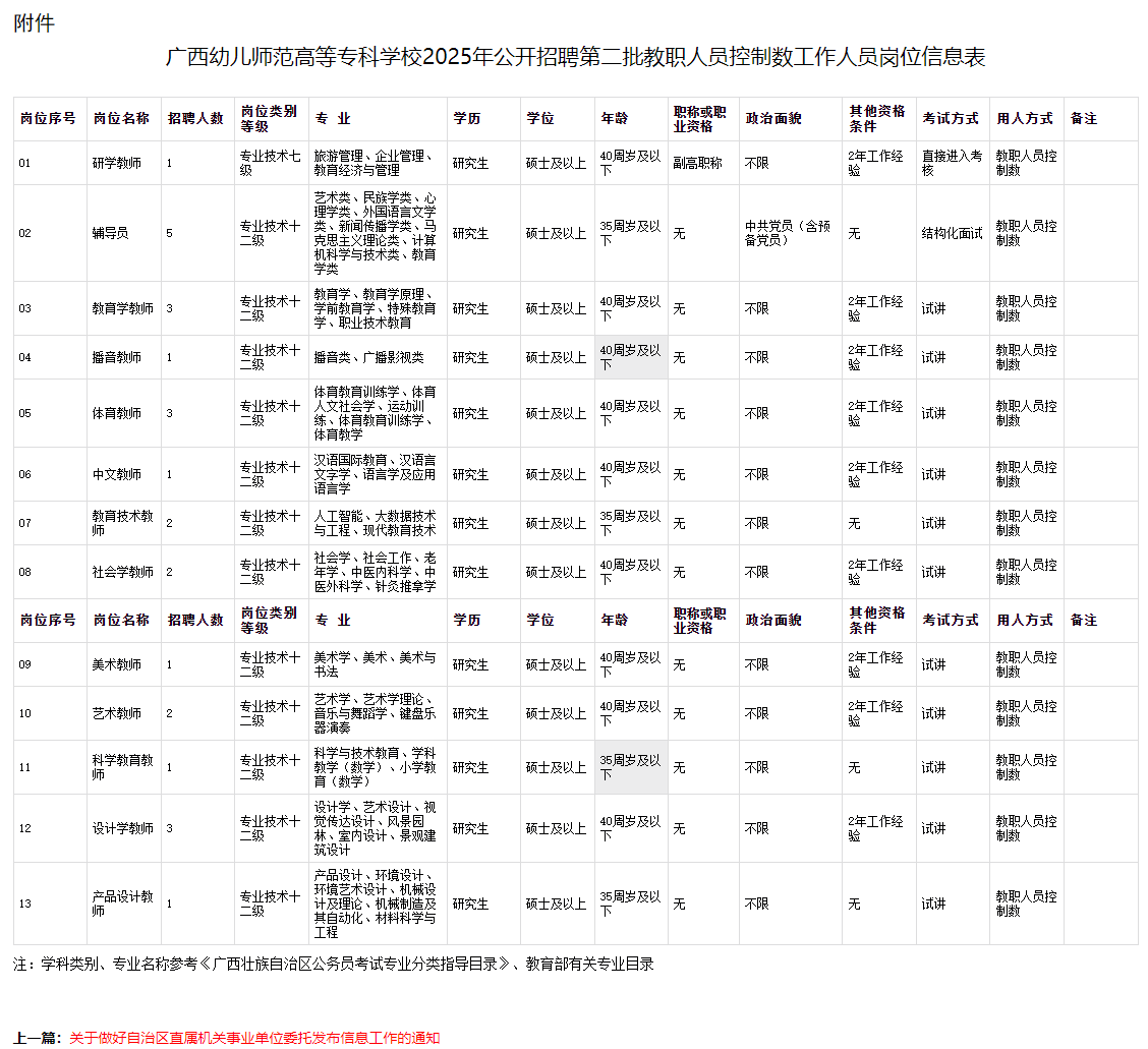 本次公開招聘工作人員26名,具體招聘崗位及要求詳見《廣西幼兒師范高等??茖W(xué)校2025年公開招聘第二批教職人員控制數(shù)工作人員崗位信息表》(附件)。