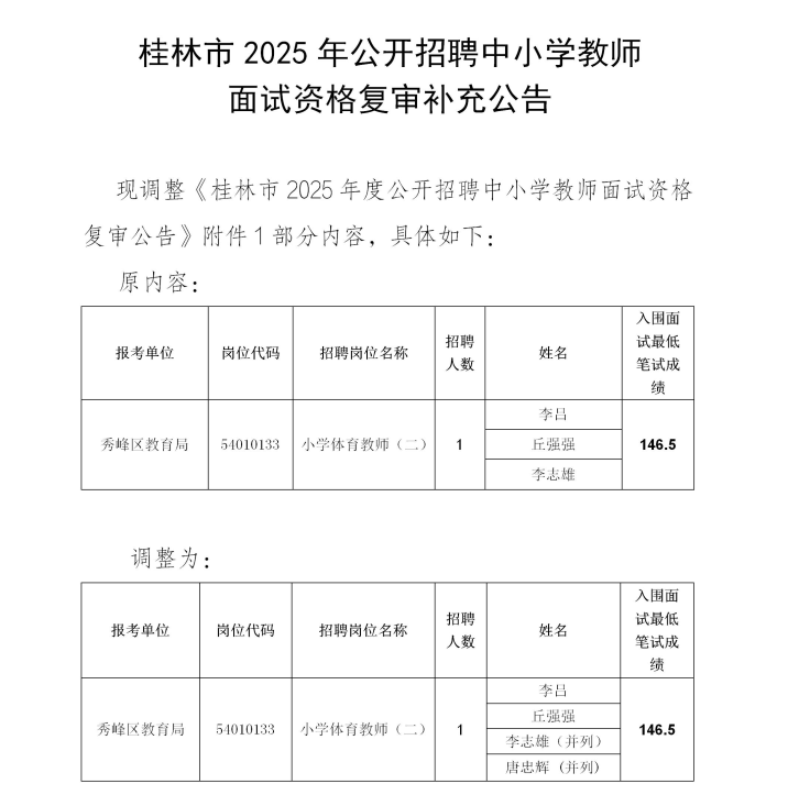 桂林市2025年公開招聘中小學(xué)教師面試資格復(fù)審補(bǔ)充公告