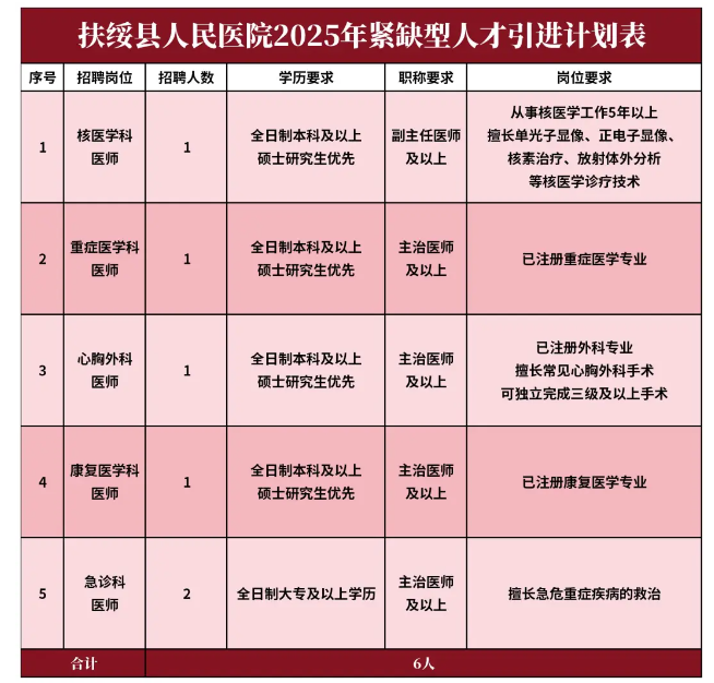 為進一步充實現(xiàn)有人才隊伍,促進醫(yī)院學科發(fā)展,提升醫(yī)院綜合實力,結合醫(yī)院實際工作需要,扶綏縣人民醫(yī)院決定面向社會進行公開招聘各類醫(yī)學人才,具體招聘事宜如下: