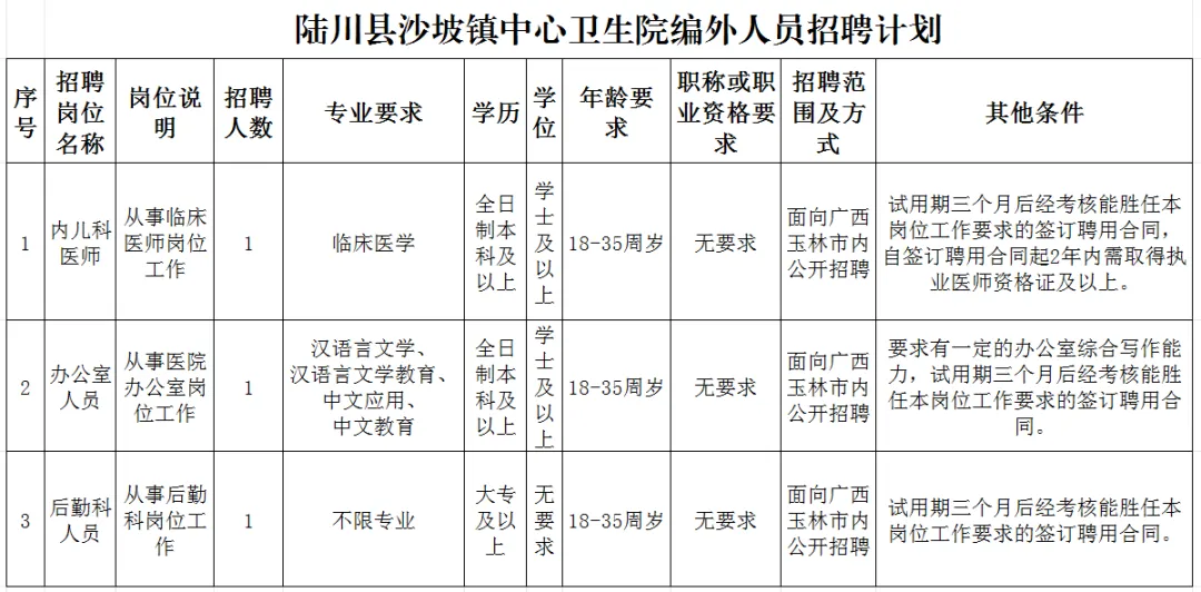 報名地點:陸川縣沙坡鎮(zhèn)中心衛(wèi)生院公衛(wèi)樓五樓行政辦公室。(咨詢電話:7012189)。