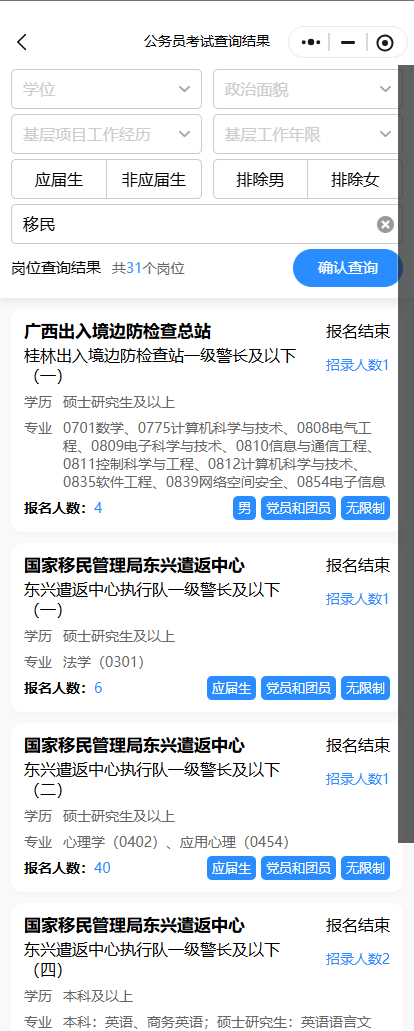 如駐廣西移民管理機構崗位,在公考天眼輸入【移民】可查出2025年國考廣西崗位中,有31個崗位信息↓