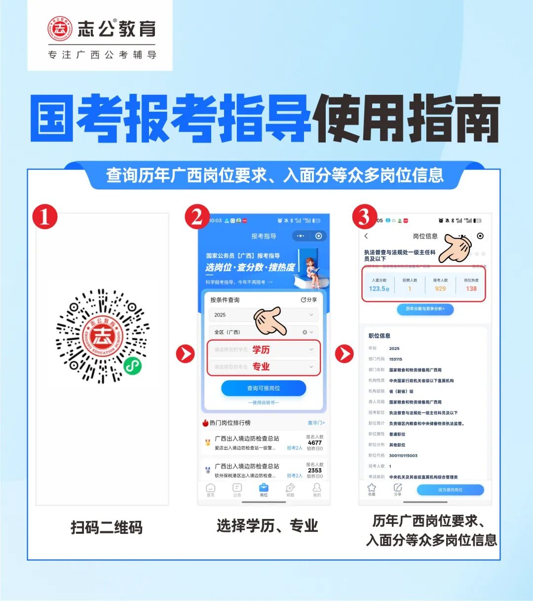 ?善用工具篩選:在志公教育研發(fā)的“公考天眼”小程序中,可獲可查詢歷年廣西崗位要求、入面分、報考人數(shù)等眾多崗位信息。
