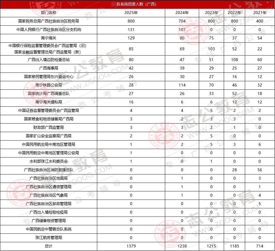 國家稅務總局廣西壯族自治區(qū)稅務局常年占據招錄首位,2025年以376個崗位、800人的招錄規(guī)模,占廣西總招錄人數(shù)的58%。此外,海關系統(tǒng)對廣西考生較為友好,平均入面分數(shù)約117分,比稅務系統(tǒng)低5分以上,且常面向冷門專業(yè)招錄,可作為特色選擇。