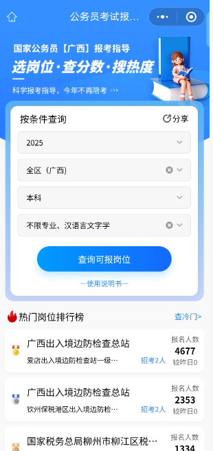 在這里,你能清晰查看各個(gè)崗位的系統(tǒng)熱度,官方報(bào)考人數(shù)、崗位報(bào)名條件,入面分?jǐn)?shù)和錄取分?jǐn)?shù),這些數(shù)據(jù)都是經(jīng)過精準(zhǔn)整理與分析的,能為你的選崗提供有力參考。