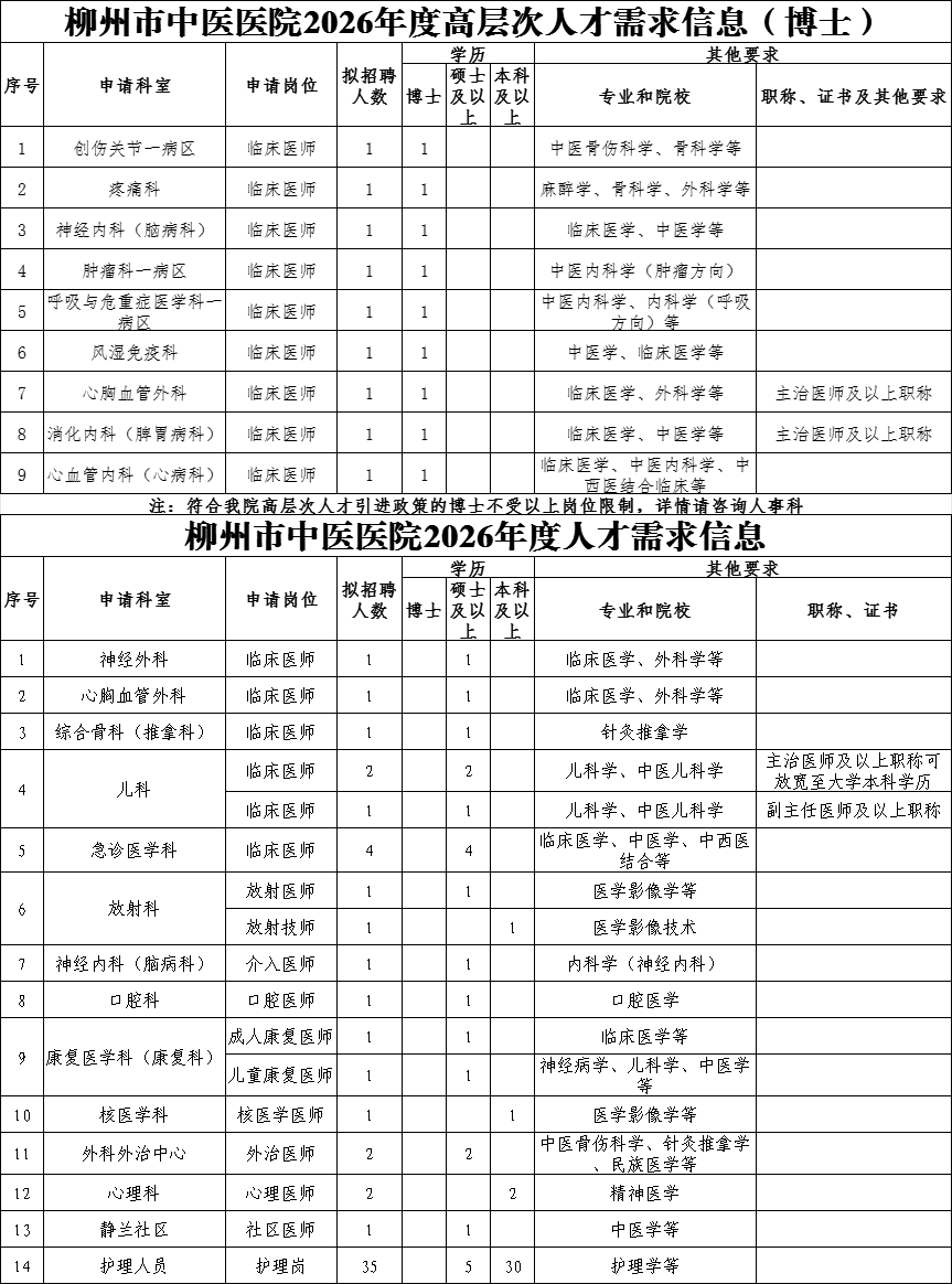 高層次人才不受招聘崗位限制,均可一事一議、一人一議。高層次人才(博士)根據(jù)醫(yī)院引進(jìn)人才制度,給予25萬(wàn)-120萬(wàn)元安家費(fèi)、5萬(wàn)-20萬(wàn)元科研啟動(dòng)經(jīng)費(fèi)。引進(jìn)的高層次人才(高級(jí)職稱或博士研究生)按柳州市有關(guān)政策提供事業(yè)編制,協(xié)助其解決子女入學(xué)和配偶工作。2026年醫(yī)學(xué)類緊缺人才擬招聘醫(yī)師7人,緊缺人才科室為心理科(精神衛(wèi)生專業(yè))、神經(jīng)外科、急診醫(yī)學(xué)科,擬享受柳州市中醫(yī)醫(yī)院人才引進(jìn)醫(yī)學(xué)類緊缺人才安家費(fèi)2-20萬(wàn)元,同時(shí)按照國(guó)家、廣西壯族自治區(qū)、柳州市及醫(yī)院有關(guān)政策享受工資及福利待遇,獎(jiǎng)勵(lì)性績(jī)效工資按照醫(yī)院同級(jí)同類人員規(guī)定執(zhí)行。如為學(xué)科帶頭人或高層次人才則另按其標(biāo)準(zhǔn)享受相關(guān)待遇。
