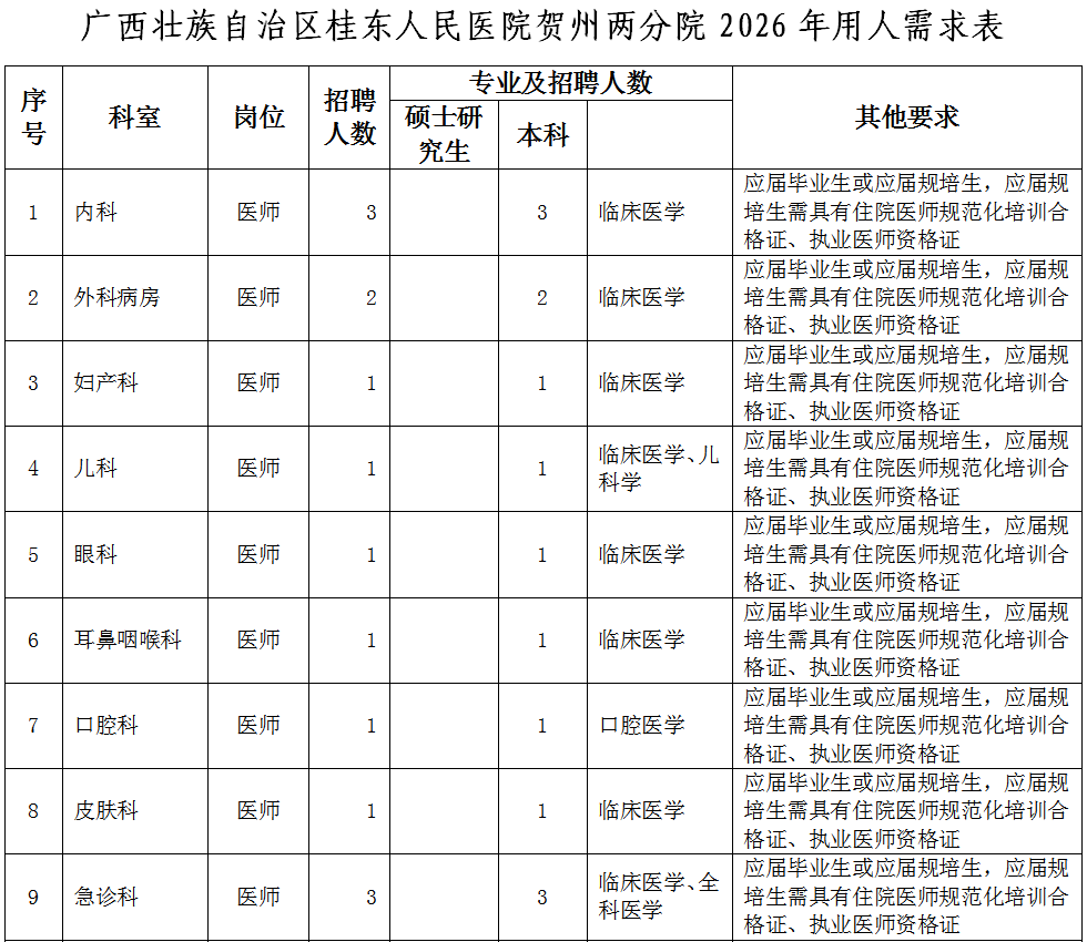 (應(yīng)聘報(bào)名二維碼)同時(shí),按以下要求提供個(gè)人應(yīng)聘材料(電子版)發(fā)電子郵箱:gdyy2817726@163.com(郵件主題請(qǐng)標(biāo)明:“姓名+賀州兩分院”字樣)。應(yīng)屆畢業(yè)生:個(gè)人簡(jiǎn)歷、身份證、就業(yè)推薦表、成績(jī)單、各種獎(jiǎng)項(xiàng)獎(jiǎng)勵(lì)證書(shū)、外語(yǔ)等級(jí)證書(shū)等。非應(yīng)屆畢業(yè)生:個(gè)人簡(jiǎn)歷、身份證、畢業(yè)證、畢業(yè)證備案登記表、學(xué)位證、學(xué)位證備案登記表、職稱(chēng)證、執(zhí)業(yè)證、住院醫(yī)師規(guī)范化培訓(xùn)合格證、工作證明等。報(bào)名時(shí)所提交的申請(qǐng)材料必須真實(shí)、準(zhǔn)確,因報(bào)名時(shí)提交的申請(qǐng)材料不真實(shí)、不完整或錯(cuò)誤填寫(xiě)報(bào)名信息,造成資格審查、面試資格審查不通過(guò)的,后果由報(bào)名人員自行承擔(dān)。(2)資格審核。人事科依據(jù)招聘公告和用人需求規(guī)定的資格條件對(duì)應(yīng)聘人員簡(jiǎn)歷進(jìn)行收集和資格初步審查,經(jīng)招聘工作領(lǐng)導(dǎo)小組審核后,確定符合崗位條件報(bào)名人員名單,由醫(yī)院人事科電話(huà)或短信通知符合條件人員。(3)考核。考核筆試和面試由人事科負(fù)責(zé)組織實(shí)施,協(xié)助部門(mén)為醫(yī)務(wù)部、護(hù)理部、科教科以及用人科室,紀(jì)律監(jiān)督部門(mén)為監(jiān)察室。逾期未參加則視為自愿放棄。(4)試工。通過(guò)考核的非應(yīng)屆畢業(yè)應(yīng)聘人員,須到醫(yī)院試工5天。試工不通過(guò),不予聘用。(5)體檢。體檢工作由廣西壯族自治區(qū)桂東人民醫(yī)院按照有關(guān)規(guī)定統(tǒng)一組織。體檢標(biāo)準(zhǔn)參照《廣西壯族自治區(qū)事業(yè)單位公開(kāi)招聘人員體檢通用標(biāo)準(zhǔn)(試行)》《廣西壯族自治區(qū)事業(yè)單位公開(kāi)招聘人員體檢操作手冊(cè)(試行)》執(zhí)行。體檢不合格或隱瞞真實(shí)情況致使體檢結(jié)果失真的,不予聘用。因體檢不合格空缺崗位的,將按考核的綜合成績(jī),從高到低,順位補(bǔ)充體檢人員。(6)公示和聘用。對(duì)擬聘非應(yīng)屆畢業(yè)應(yīng)聘者在全院范圍內(nèi)進(jìn)行公示,公示期為5個(gè)工作日,公示期滿(mǎn)無(wú)異議按程序辦理聘用手續(xù)。對(duì)公示有異議,經(jīng)核實(shí)影響聘用的,取消其聘用資格;對(duì)反映問(wèn)題難以核實(shí)的暫緩聘用,待核實(shí)清楚后按有關(guān)規(guī)定辦理。