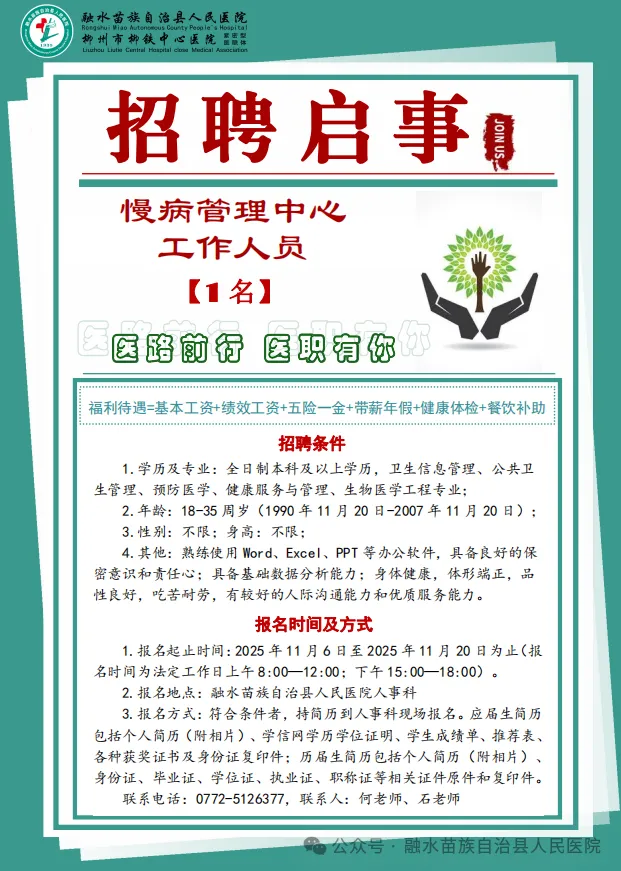 原文標題:融水苗族自治縣人民醫(yī)院招聘慢病管理中心工作人員1名