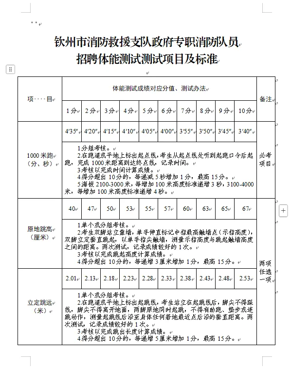 2.體能測(cè)試:(1)必考項(xiàng)目:1000米跑;(2)選考項(xiàng)目:①立定跳遠(yuǎn)、原地跳高二選一;②單杠引體向上、俯臥撐二選一;③10米×4往返跑、100米跑二選一;(3)注意事項(xiàng):應(yīng)聘人員須參加體能測(cè)試,并當(dāng)場(chǎng)簽訂《體能測(cè)試健康安全風(fēng)險(xiǎn)承諾書(shū)》,體能測(cè)試有兩項(xiàng)及兩項(xiàng)以上不得分的視為不合格(標(biāo)準(zhǔn)參照附件)。未按時(shí)參加或因身體原因無(wú)法測(cè)試者,視為自動(dòng)放棄。(體能測(cè)試測(cè)試項(xiàng)目及標(biāo)準(zhǔn)附后)