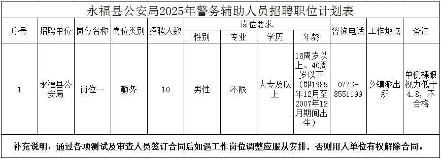 對(duì)確定聘用的警務(wù)輔助人員與永福縣公安局簽訂勞動(dòng)合同(合同期三年,試用期六個(gè)月,試用期滿經(jīng)考核不適合崗位工作的,解除聘用合同),從事警務(wù)輔助工作。警務(wù)輔助人員依法履行輔助性工作職責(zé),由公安機(jī)關(guān)管理使用、不具有人民警察身份,在公安機(jī)關(guān)及其人民警察的指揮和監(jiān)督下開展輔助性工作。