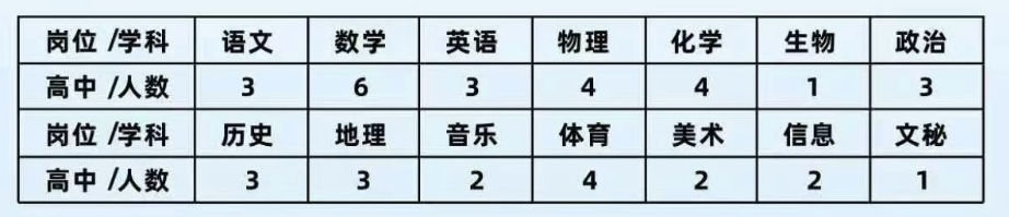 學(xué)校于2023年9月1日正式開(kāi)學(xué),現(xiàn)有30個(gè)行政班,一千余名學(xué)生,專任教師128人,發(fā)展勢(shì)頭強(qiáng)勁。為適應(yīng)學(xué)校未來(lái)發(fā)展需要,特面向全國(guó)師范類畢業(yè)生擇優(yōu)招聘青年教師若干,詳情如下: