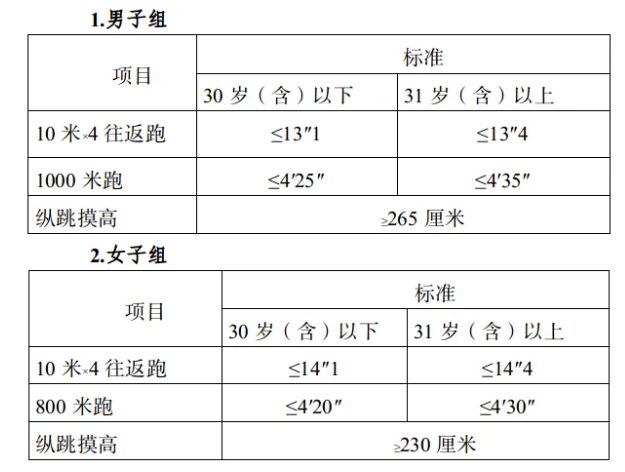 參照《關(guān)于印發(fā)<公安機(jī)關(guān)錄用人民警察體能測(cè)評(píng)項(xiàng)目和標(biāo)準(zhǔn)>的通知》(公政治〔2024〕60號(hào))執(zhí)行,每個(gè)測(cè)評(píng)項(xiàng)目分別記錄成績。其中縱跳摸高的測(cè)評(píng)次數(shù)不超過3次,10米×4往返跑測(cè)評(píng)次數(shù)不超過2次,男子1000米跑、女子800米跑測(cè)評(píng)次數(shù)均為1次。